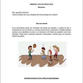 Essa brincadeira pode ser realizada em frente ao espelho, o adulto irá dar o comando de vivo ou morto e a criança deverá fazer a posição, os bebês podem realizar essa atividade no colo e se estiverem em frente ao espelho será mais divertida. Pode fazer variações durante a brincadeira, solicitar que as crianças rodem ou pulem.